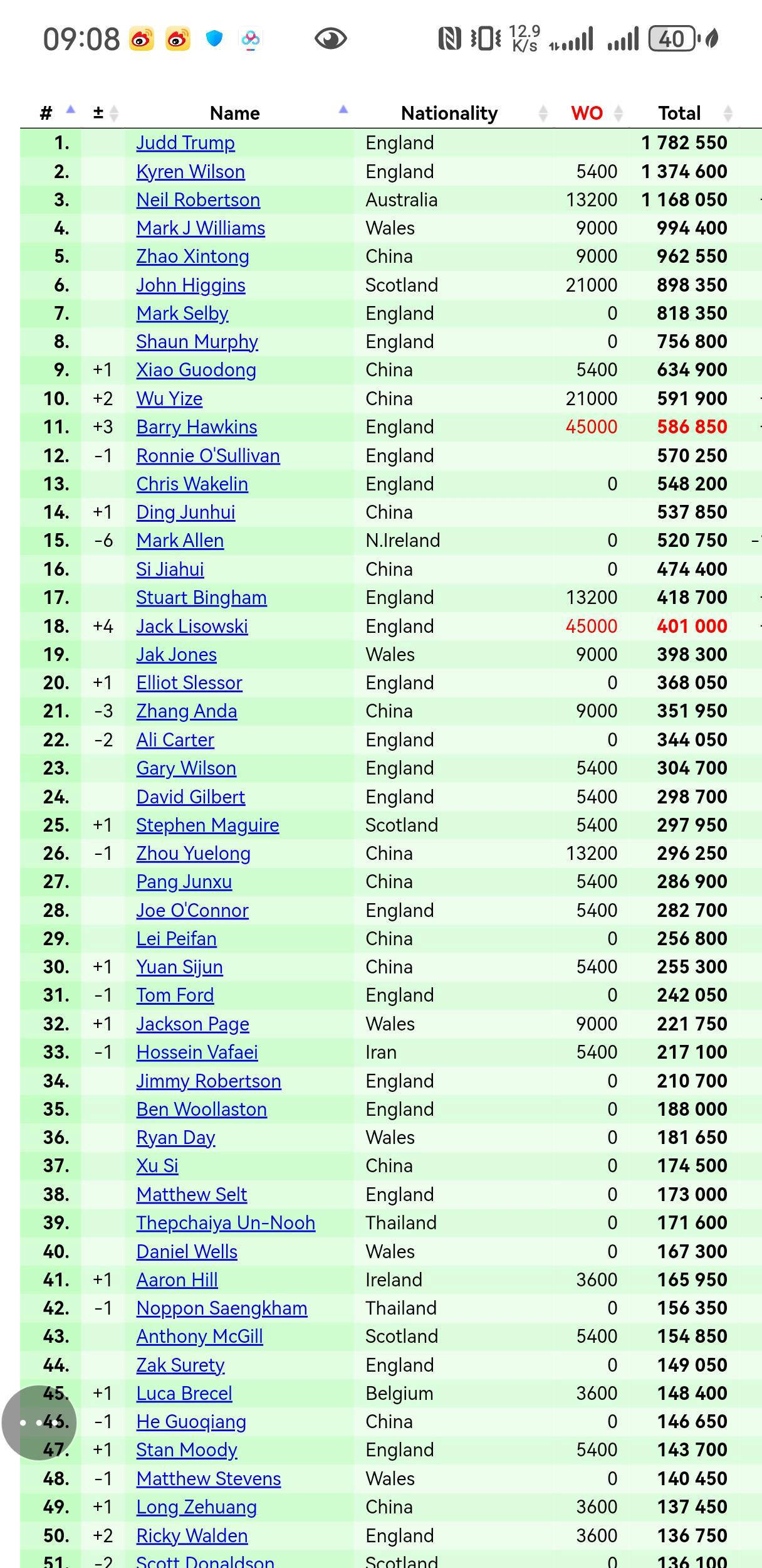 前三甲的格局依然坚固,贾德·特鲁姆普凭借本赛季一系列稳定的优异战绩,牢牢掌控世界第一的位置。凯伦·威尔逊和尼尔·罗伯逊分列第二和第三位置,三人构成坚如磐石的顶尖梯队,近期难以被撼动。马克·威廉姆斯以995,400英镑紧随其后,虽未能突破百万奖金大关,但依旧保持在第四名。赵心童则凭借球员锦标赛的连续夺冠佳绩,上升至第五,手握96万英镑积分,距离百万级别仅一步之遥。未来若他在下一阶段的世界公开赛、巡回锦标赛及世锦赛中持续发挥稳定,有望首次突破百万积分大关,向世界前四发起强有力冲击。