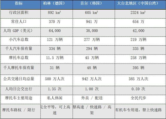 我国大台北地区(包括台北市和新北市)人口约654万人,摩托车保有量高达258万辆。相比之下,韩国首尔人口为941万,摩托车则只有约45万辆,千人保有量只有大台北地区的12%。可以说,两地在摩托车使用方面是天差地远。