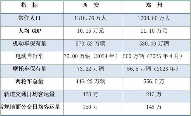 2017年,西安是全国第一个对摩托车解禁的中心城市,郑州则至今仍保留有摩托车的“禁限”政策。两地在人口规模、经济发展、地域区位等方面有较强的可比性。从下面这张表来看,如果将电动自行车与摩托车合并进行比较,西安解禁摩托车对于两轮车总量并没有明显的带动作用。由于相比郑州,西安建成区居住人口密度更高(每平方公里1.54万人,郑州为1.18万人),在全国仅次于深圳,更加适合公共交通出行,其两轮车数量甚至还略少于郑州。