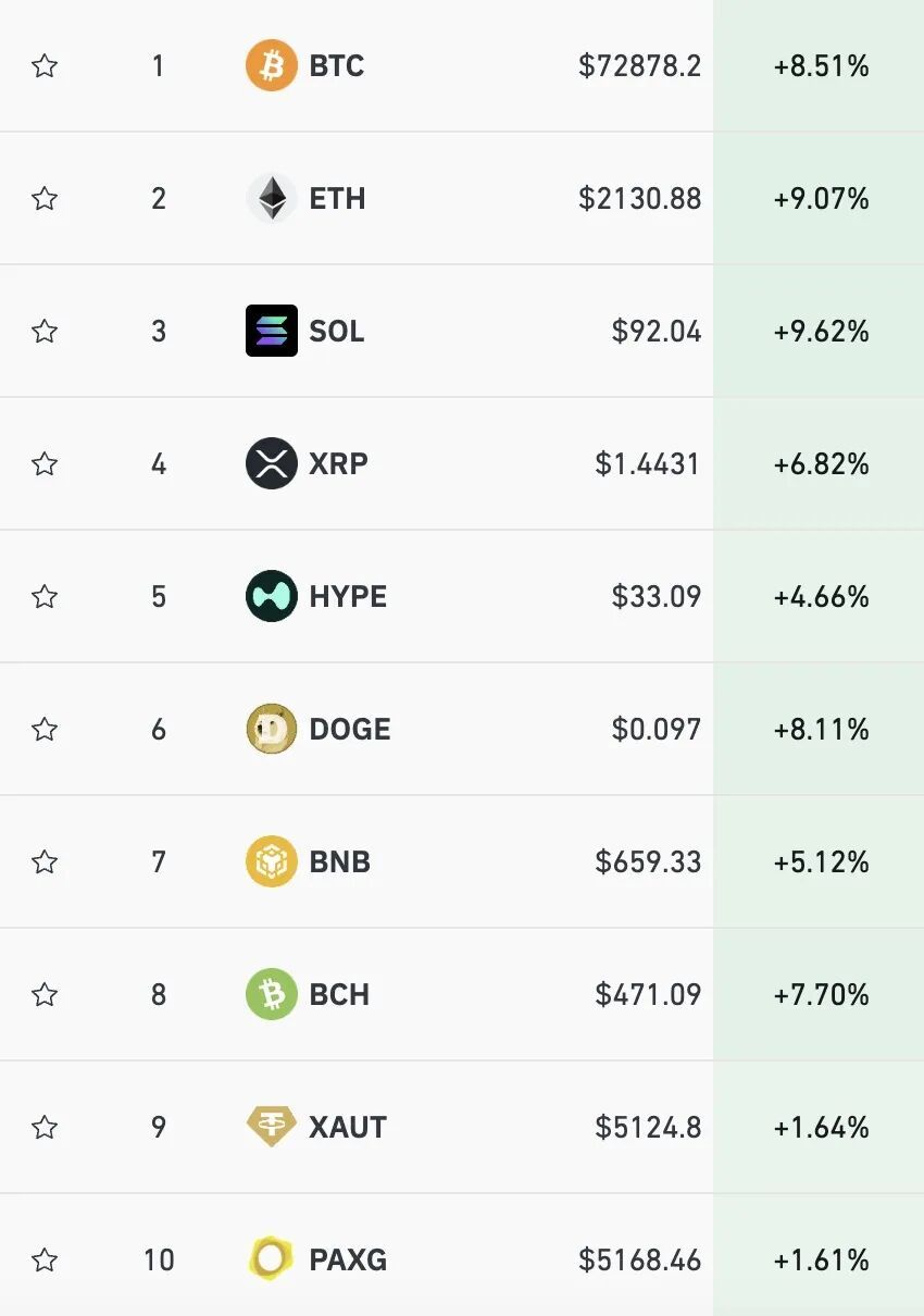 加密货币持续走高,比特币涨至72878.2美元,日内涨幅一度达到8.51%;以太坊涨至2130.88美元,过去24小时内涨9%。