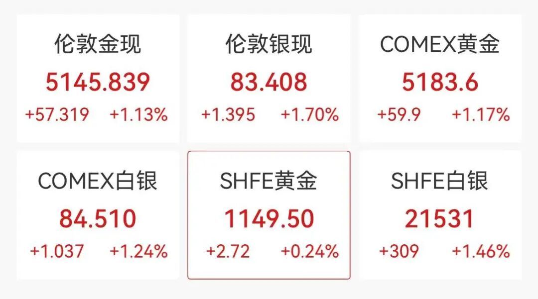 现货金银价格日内均涨超1%。现货黄金报5145美元/盎司;现货白银报83.4美元/盎司。